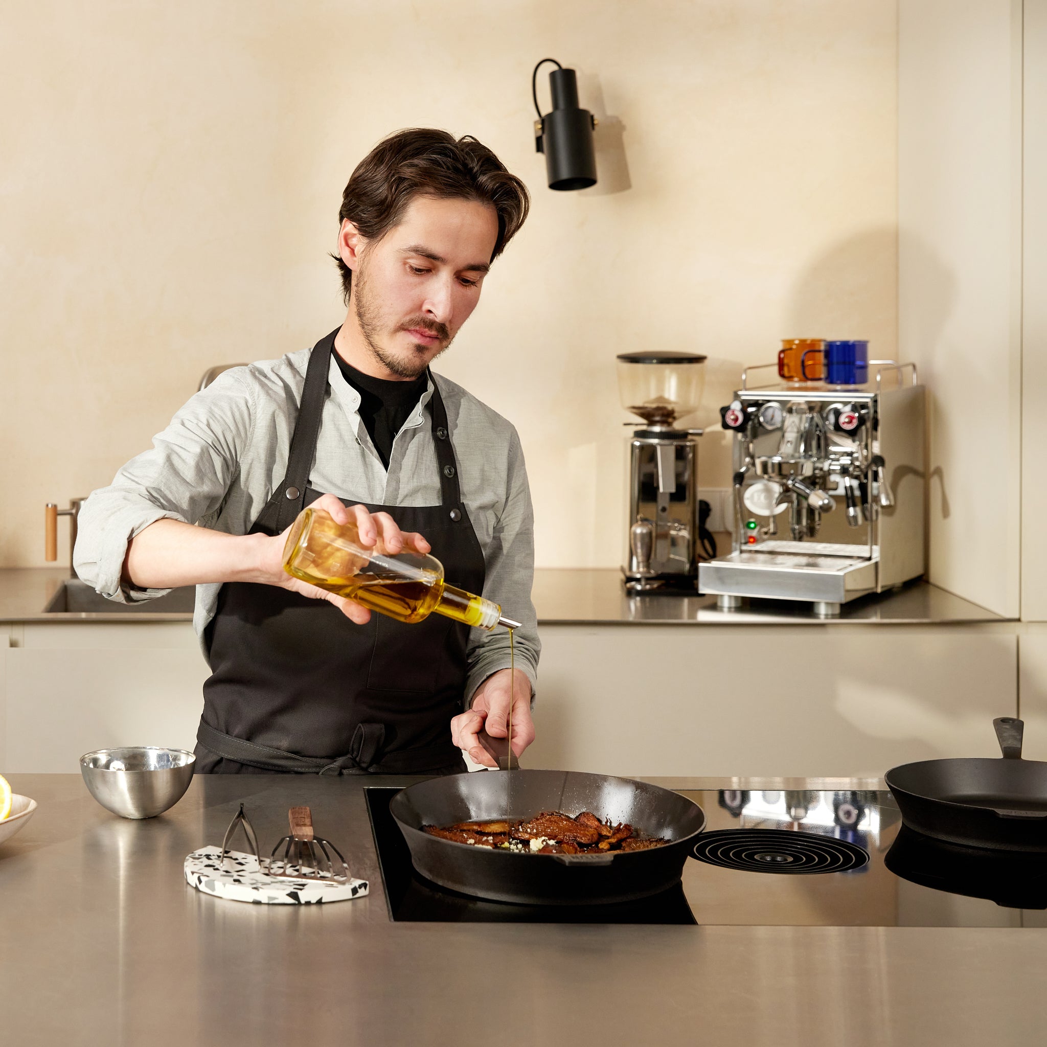 Unsere Pfannen werden mit modernster Technik veredelt, um leichter und präziser verarbeitet zu sein als herkömmliches Gusseisen. Sie sind frei von PFAS, PTFE und anderen Chemikalien – nur reines Material, das mit der Zeit besser wird.