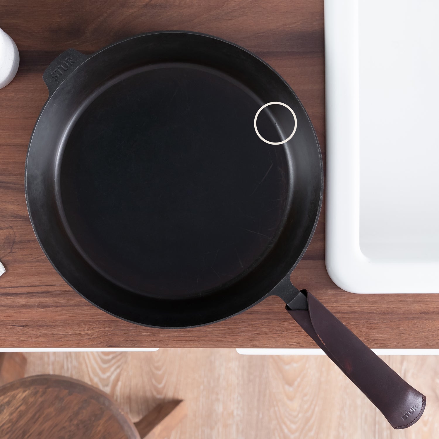 Nach einiger Zeit auf dem Herd – in der Regel aber erst nach 10-15 Minuten – wird der Griff allerdings heiß. Als Hitzeschutz für die Verwendung auf dem Herd bieten wir deshalb optional unseren STUR-Griffschutz aus Leder an. Diesen bringst Du vor dem Braten einfach an der kalten Pfanne an.