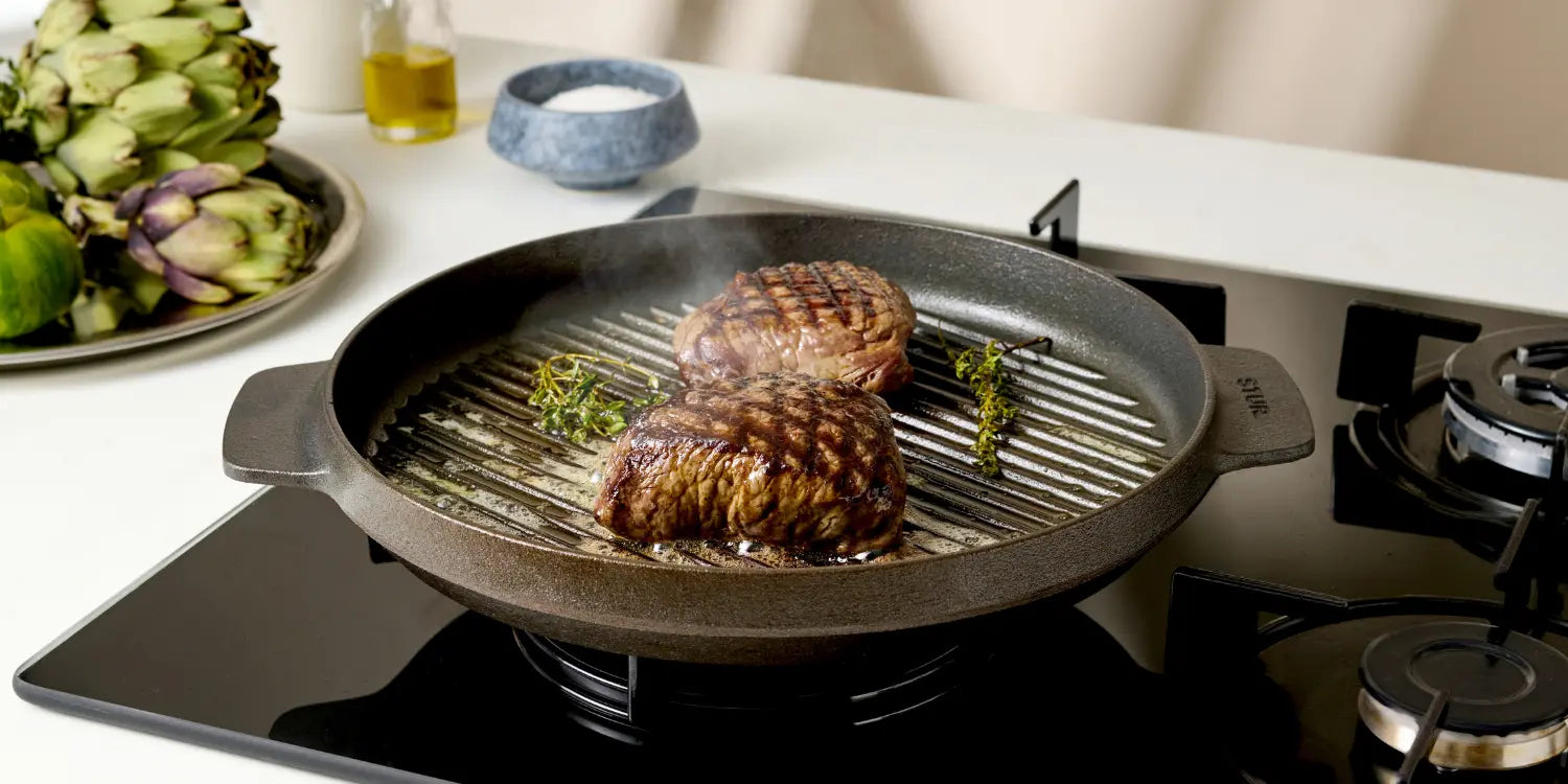 Unsere Grillpfanne bringt das Grillgefühl auf den Herd – mit tiefen Rillen für markante Grillstreifen und einem extra massiven Boden für intensive Röstaromen. Ideal für Steak, Halloumi, Gemüse & mehr – drinnen oder draußen.