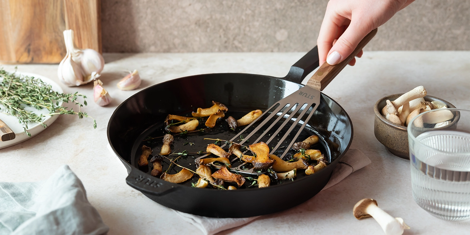 Jede STUR Pfanne wird ab Werk mit einer Schicht aus pflanzlichem Öl eingebrannt, sodass sie sofort einsatzbereit ist – und mit jedem Gebrauch noch besser wird.